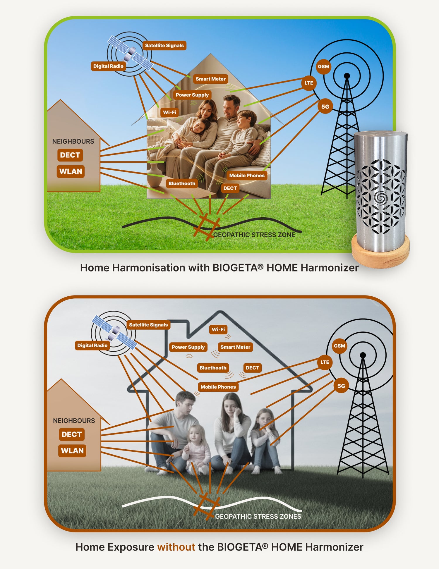 The BIOGETA® HOME HARMONIZER is the only product we know of that is able to neutralize all geopathic stress zones in the house – measurably (e.g., through a resonance test) – and to compensate for the damaging effects of electrosmog, or at least to significantly reduce them.