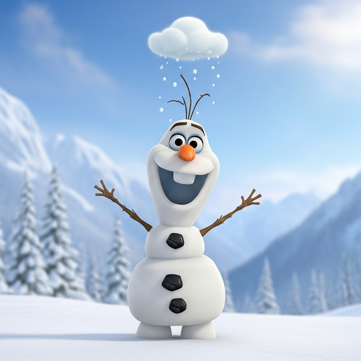 Olaf ist der fröhliche Schneemann aus dem Disney-Film „Die Eiskönigin“. Damit er im Sommer nicht schmilzt, hat ihm die Eiskönigin eine kleine Wolke gezaubert, die ihn überall begleitet.