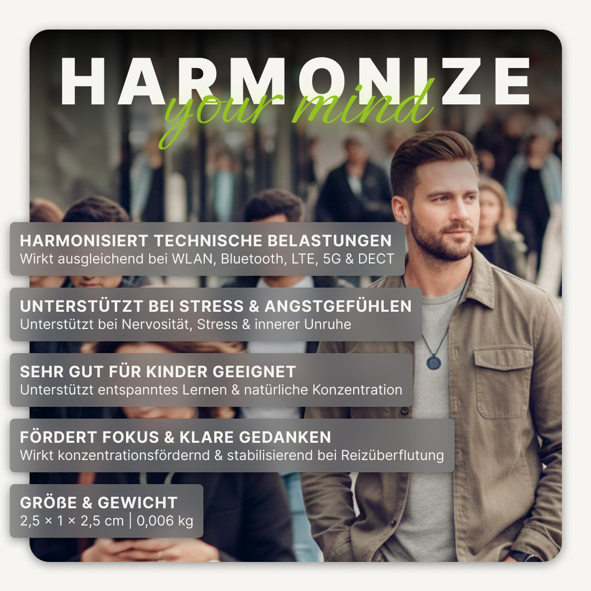 - Neutralisiert belastende Frequenzen im Alltag (WLAN, Bluetooth, LTE, 5G, DECT)