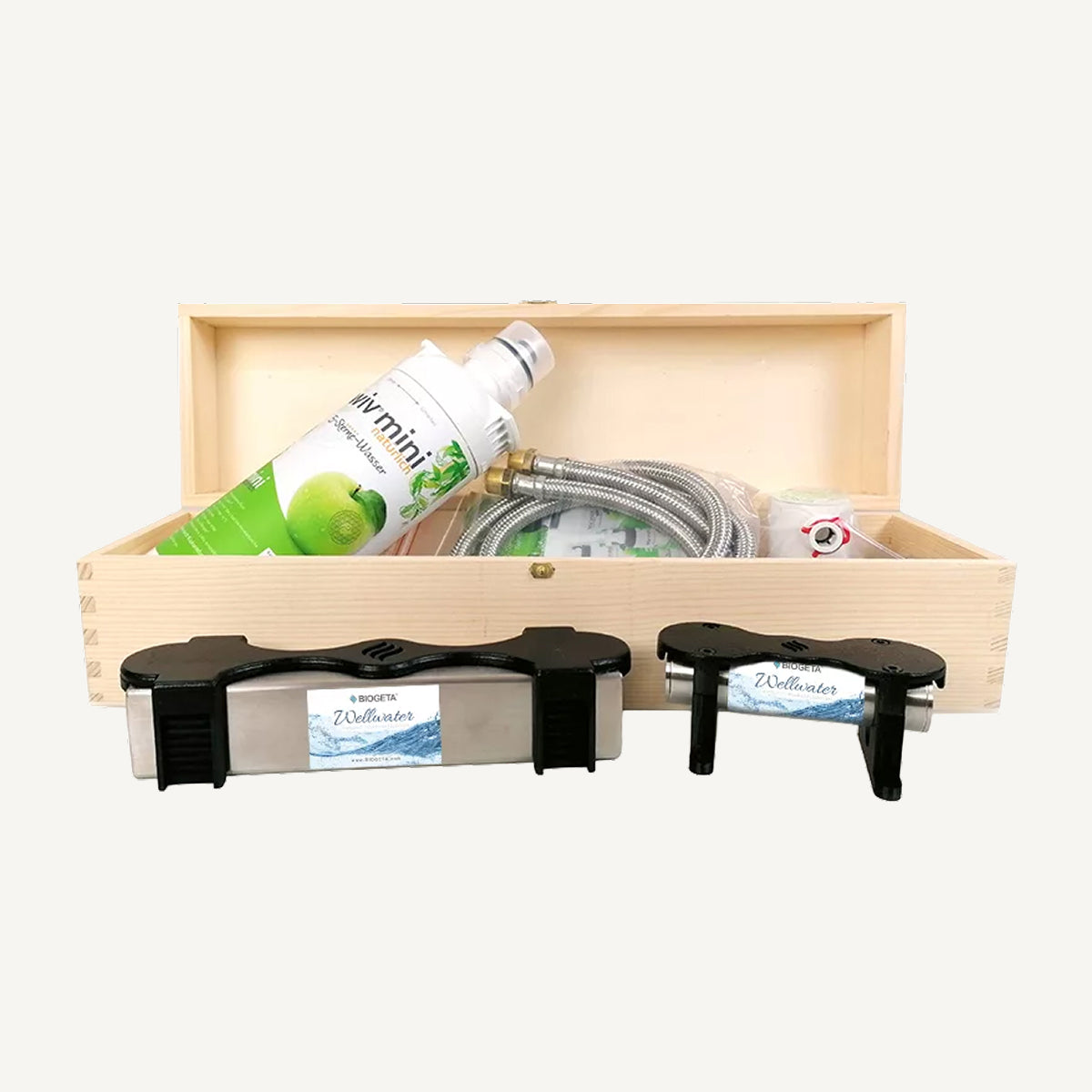 WiV® Mini Filter (optional): Filtert Chlor, Sedimentkalk, Medikamentenreste, Schwermetalle, Mikroplastik & mehr. Mineralien bleiben erhalten. Filterkerze: ca. 1 Jahr Haltbarkeit.