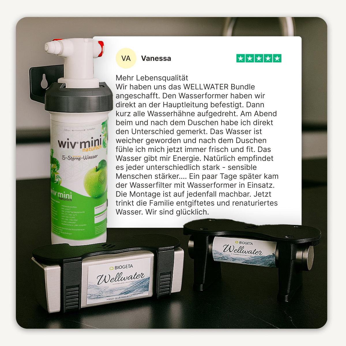 Das Wasser schmeckt spürbar weicher, fühlt sich beim Duschen angenehmer an und unterstützt ein ausgeglicheneres Raumgefühl im ganzen Haus. In Kombination mit dem optionalen WiV® Mini Wasserfilter entsteht eine starke Einheit: der Filter sorgt für kristallklare Reinheit, der Wasserformer für harmonisierte, energetisierte Struktur.